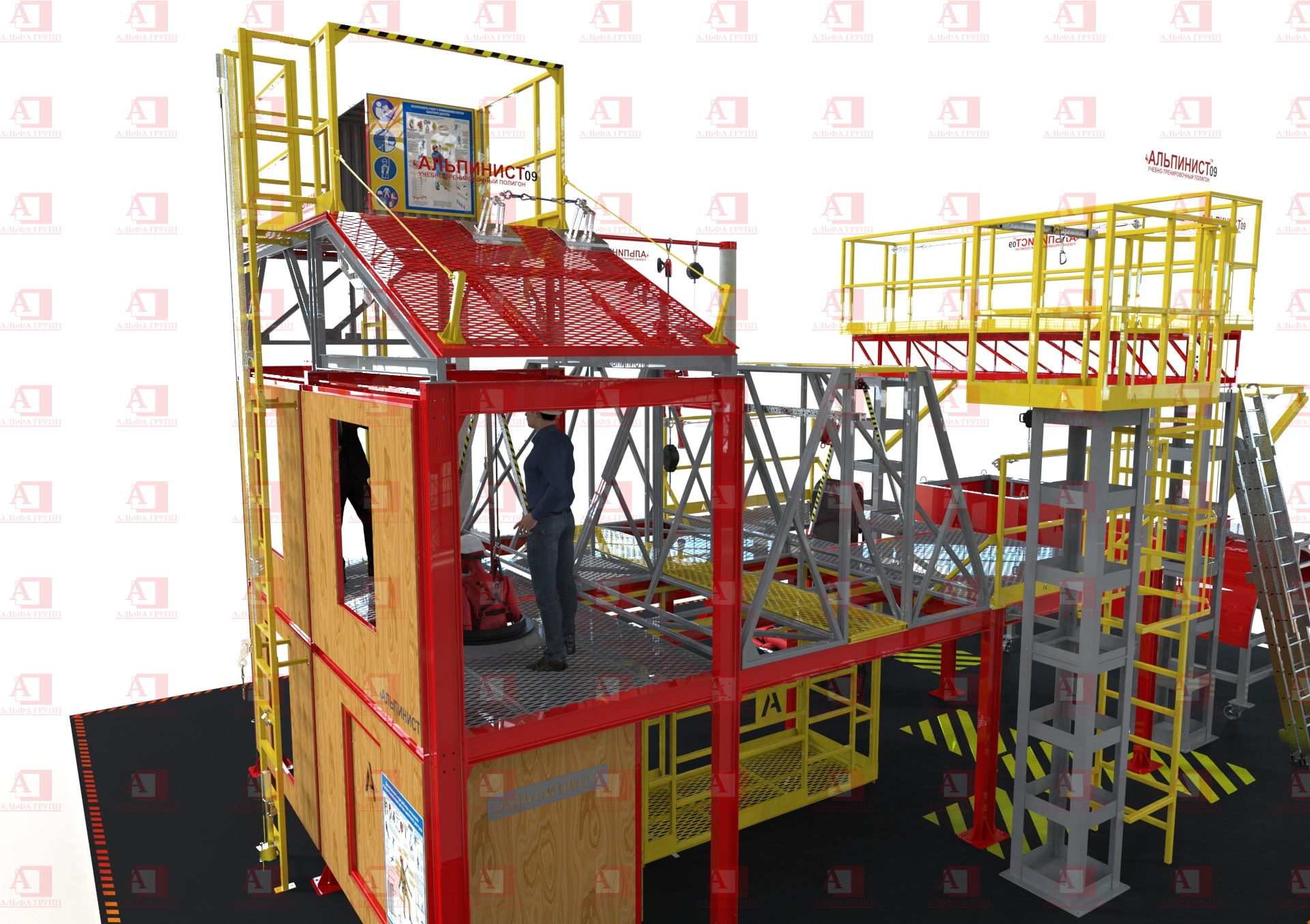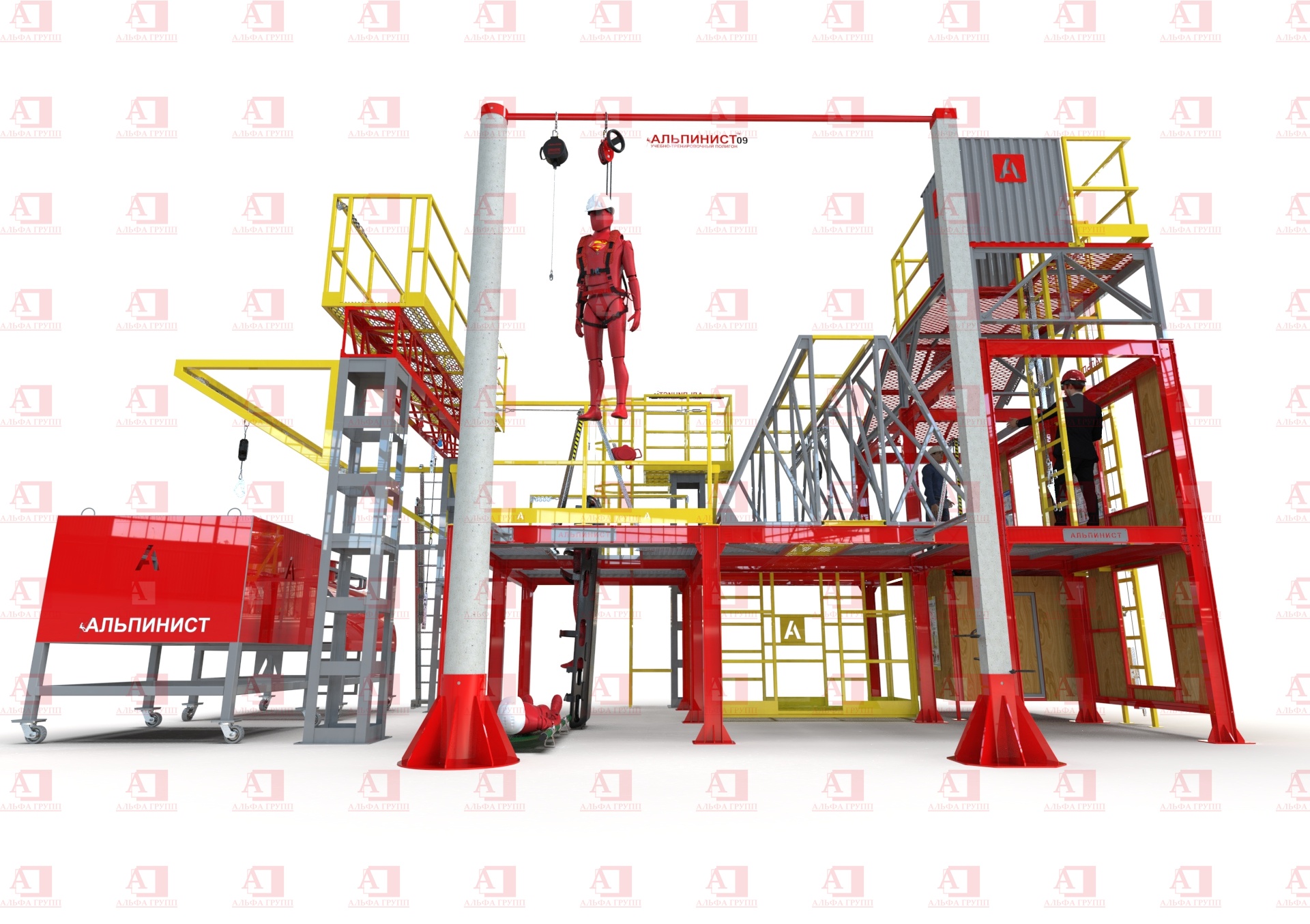 Очень функциональный, большой тренажер для практических работ на высоте для крупных учебных центров. Его возможно использовать для получения практических навыков при работах на высоте, в замкнутом пространстве и обучении спасательным работам.